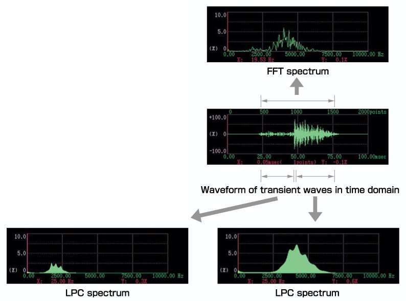 The LPC (Linear Predictive Coefficient) is much more suitable for such transient signals. The lower spectrum of Figure 1 shows that the LPC does not generate artifacts. Hence we have adopted the LPC, which, despite its computational complexity, is not an issue with today’s high-speed computers. The software executes 64-bit parallel processing using multiple CPUs.