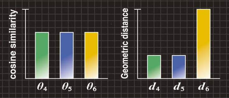 - In Figure 2B, the bar graph on the left shows the cosine similarities θ4, θ5 and θ6 between the standard sound and each of the input sounds 4, 5 and 6. The cosine similarities have the relationship of θ4=θ5=θ6, and therefore, the input sounds 4, 5 and 6 cannot be distinguished from one another.
