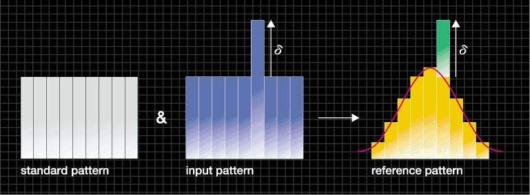 In this method, when a “difference” occurs between peaks of the standard and input patterns with a “wobble” due to noise, the “wobble” is absorbed and the distance metric increases monotonically purely in accord with the increase of the “difference”.