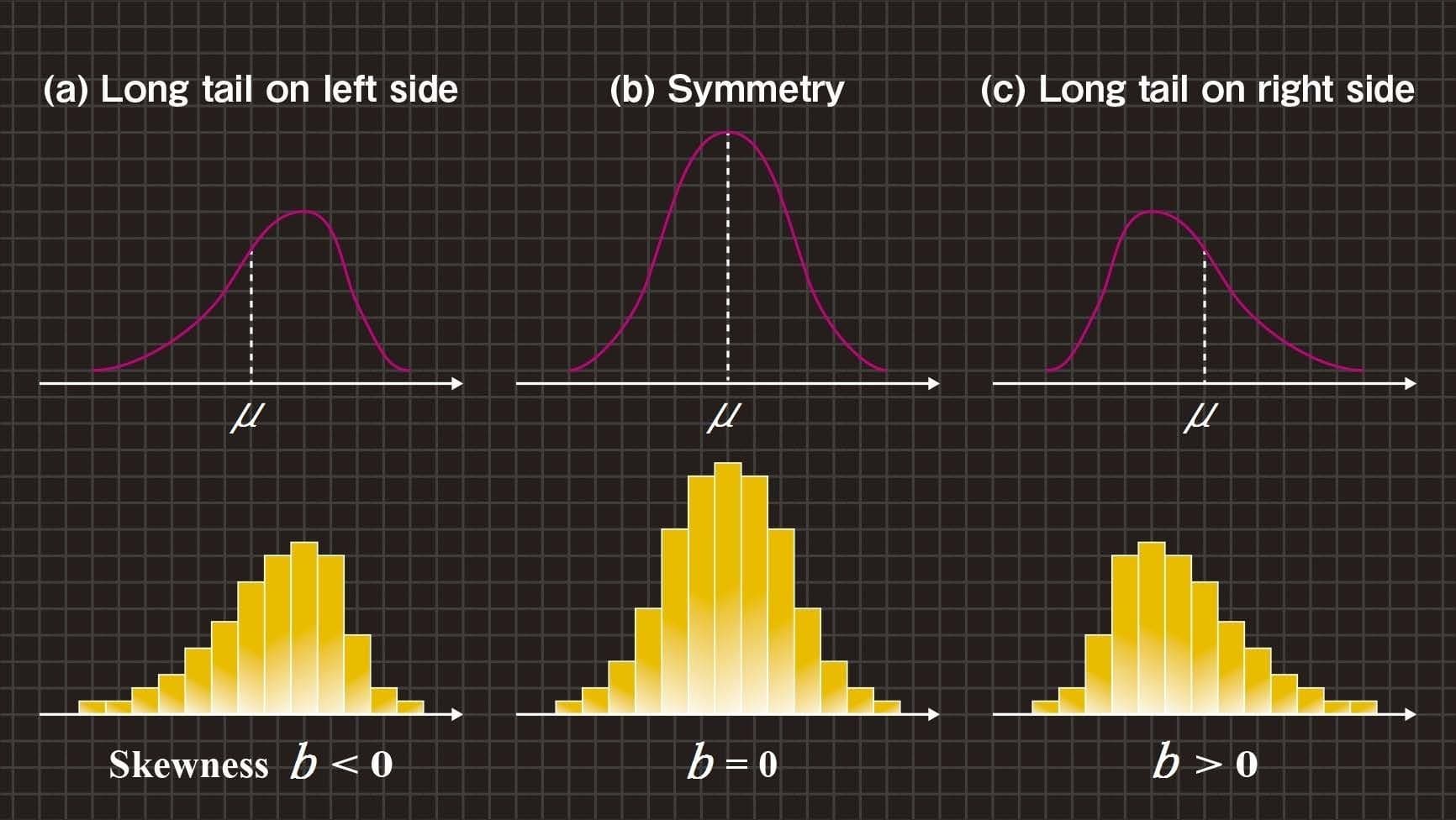 Also, if a probability distribution of the phenomenon is symmetrical about the mean μ, then b = 0 (Figure 8(b)). If the tail on the left side of the probability distribution is longer than the right side, then b < 0 (Figure 8(a)). Conversely, if the tail on the right side of the probability distribution is longer than the left side, then b > 0 (Figure 8(c)).