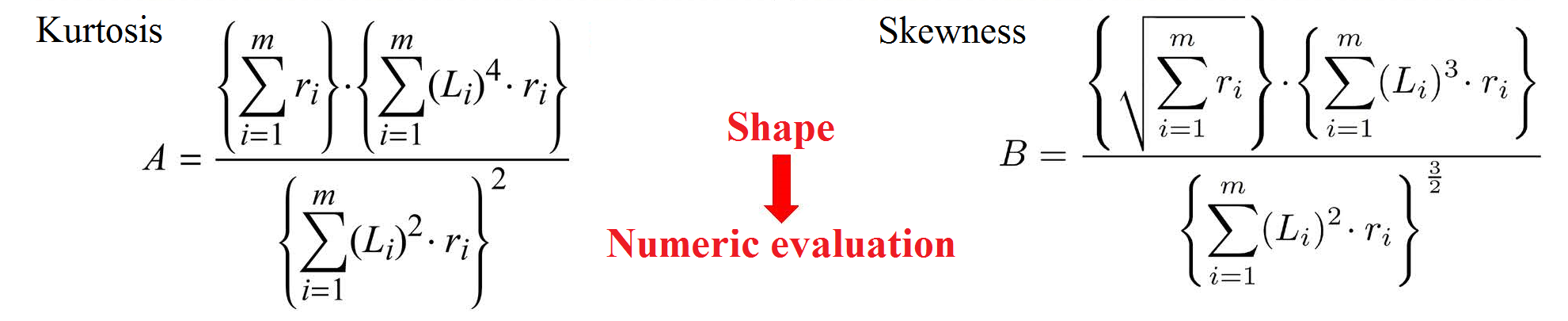 In Figure 10(c), because the shape of the reference pattern is an intermediate state between (b) and (d), the kurtosis becomes A < 3 and the skewness becomes B > 0.