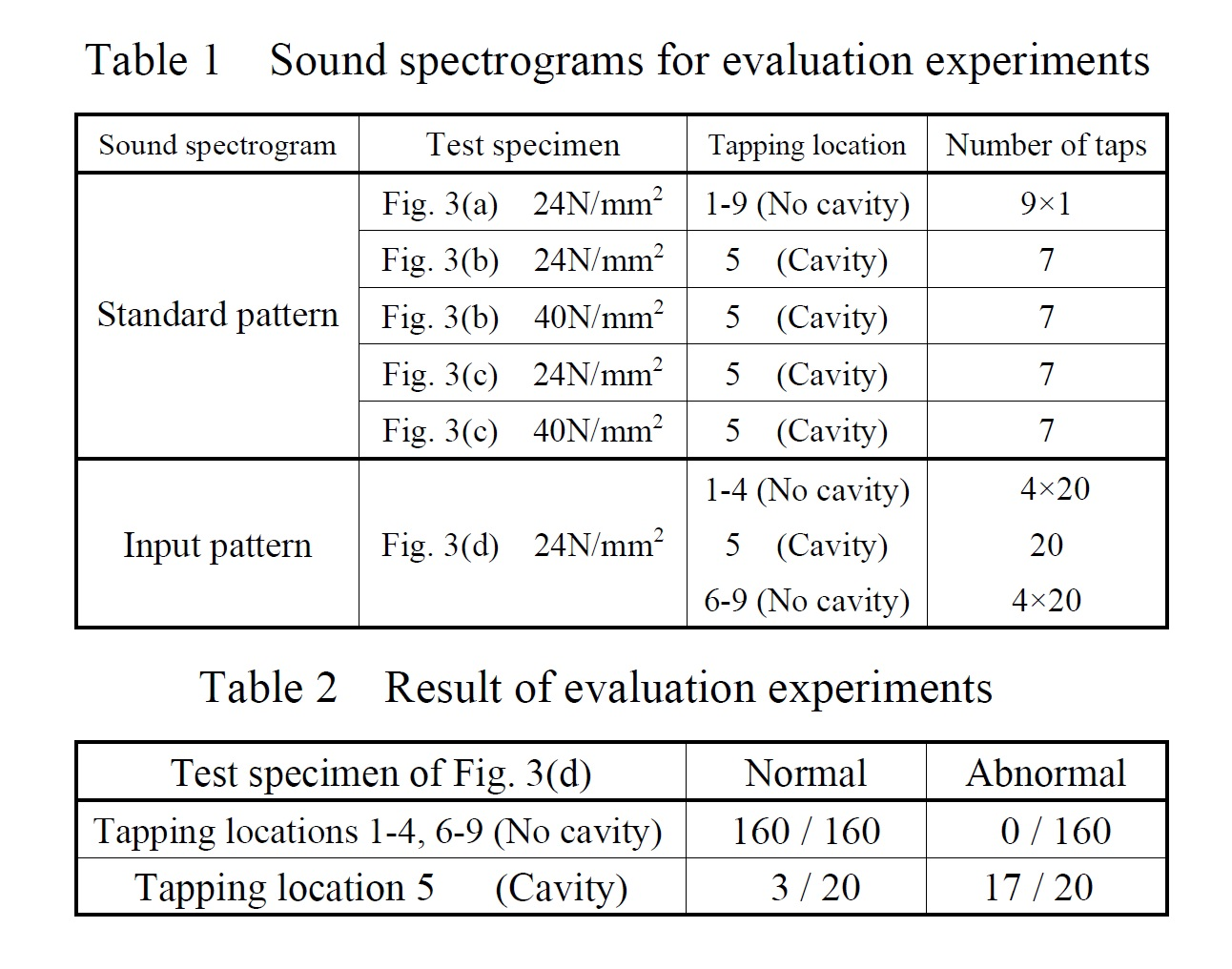 Table 2 shows the result of evaluation experiments. From Table 2, it is learned that the input sounds recorded at tapping locations 1-4 and 6-9, each beyond the cavity footprint, are recognized as ‘normal’ in all cases, and the recognition accuracy at tapping location 5 above cavities is 17/ 20. Thus we have verified the effectiveness of the GD algorithm.
