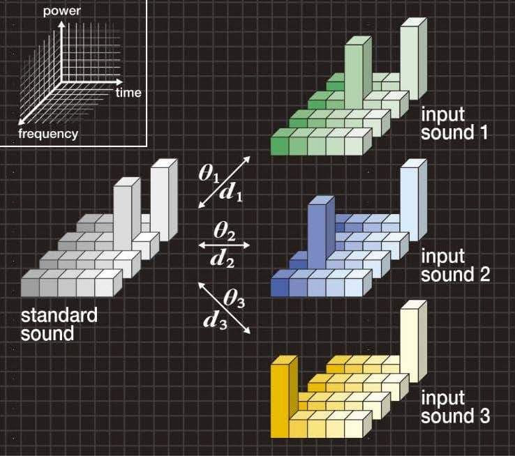 - In Figure 1B, the bar graph on the right shows the geometric distances d1, d2 and d3 between the standard sound and each of the input sounds 1, 2 and 3. The geometric distance can distinguish these three input sounds by detecting the amount of “difference in peak frequency” and “difference in peak time”.