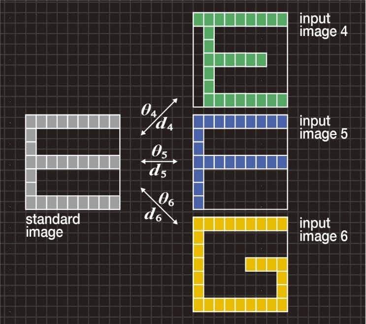 - In Figure 4B, the bar graph on the right shows the geometric distances d4, d5 and d6 between the standard image and each of the input images 4, 5 and 6. The geometric distance can recognize the letter “E” correctly after absorbing the "character deformation".