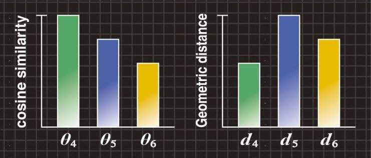 - In Figure 2B, the bar graph on the left shows the cosine similarities θ4, θ5 and θ6 between the standard sound and each of the input sounds 4, 5 and 6. The cosine similarities have the relationship of θ4=θ5=θ6, and therefore, the input sounds 4, 5 and 6 cannot be distinguished from one another.
