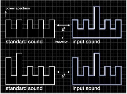 - In Figure 2B, the bar graph on the right shows the geometric distances d4, d5 and d6 between the standard sound and each of the input sounds 4, 5 and 6. The geometric distance can distinguish the input sounds 4 and 5 from input sound 6 after absorbing the “spectrum intensity wobble”.