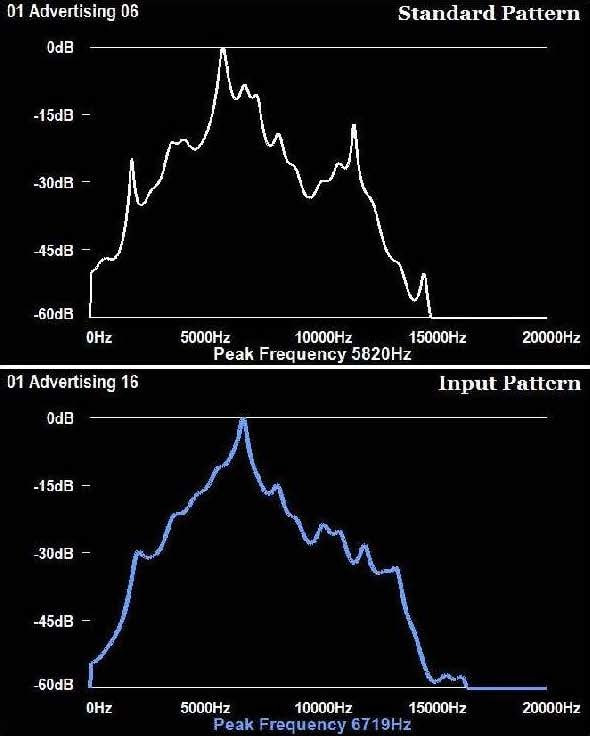 - In the power spectrum of the voice, peaks called formants are observed. For the formant peaks, a “difference in peak frequency” and a “difference in peak time” occur for every utterance, even when the same voice is uttered.