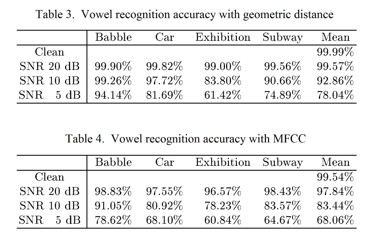 Tables 3 and 4 show the results of vowel recognition using the geometric distance and MFCC (Mel-Frequency Cepstrum Coefficients), respectively.