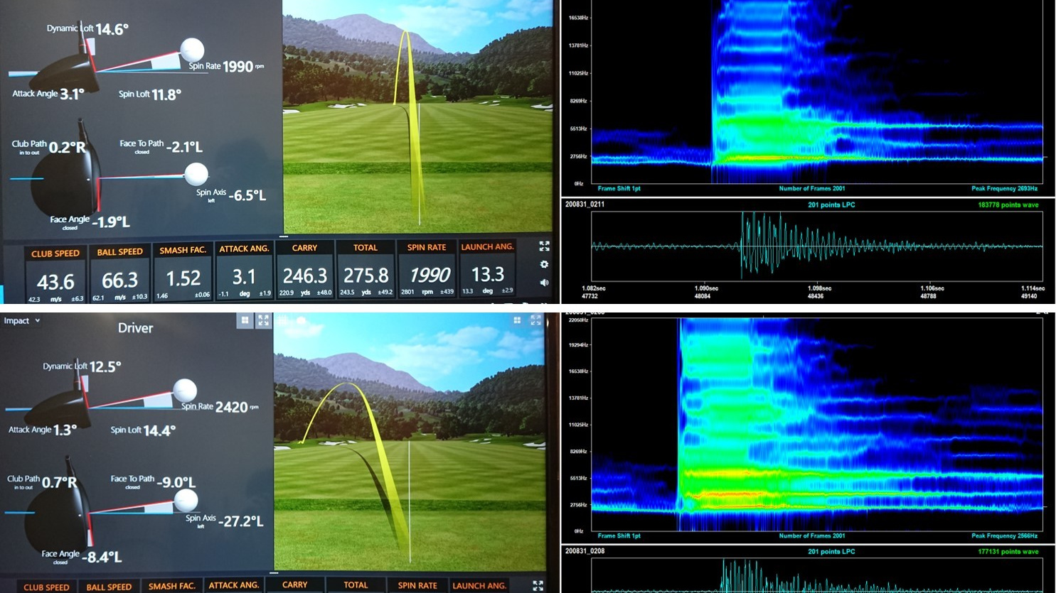 同じ方向(フェアウェイキープ)の打球において、ミート率が異なるショットの打音を比較しました。芯で捉えられていない、もしくは回転数が過剰なショットと、芯で捉えたショットには特徴に差があることがわかります。