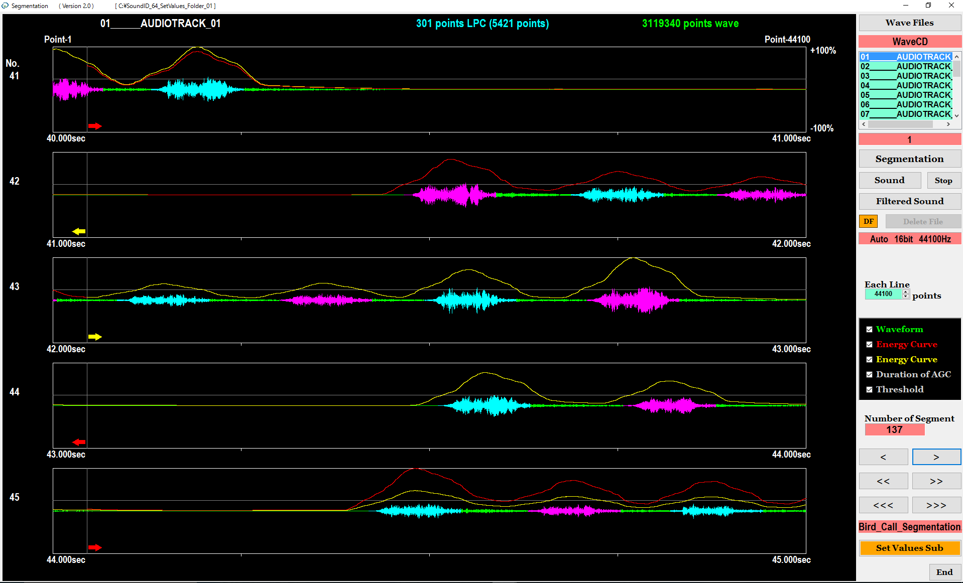 ソフトウェアの第2画面において、WAVファイルの連続録音データを入力します。図1と図2の左側に示すようにソフトウェアは、この連続波形にFIRデジタルフィルタ処理を行い、フィルタ処理後の連続波形から自動的に目的の音響波形を切り出すセグメンテーションを実行します。そして、切り出した音響波形からスペクトルパターン(入力パターン)を抽出します。