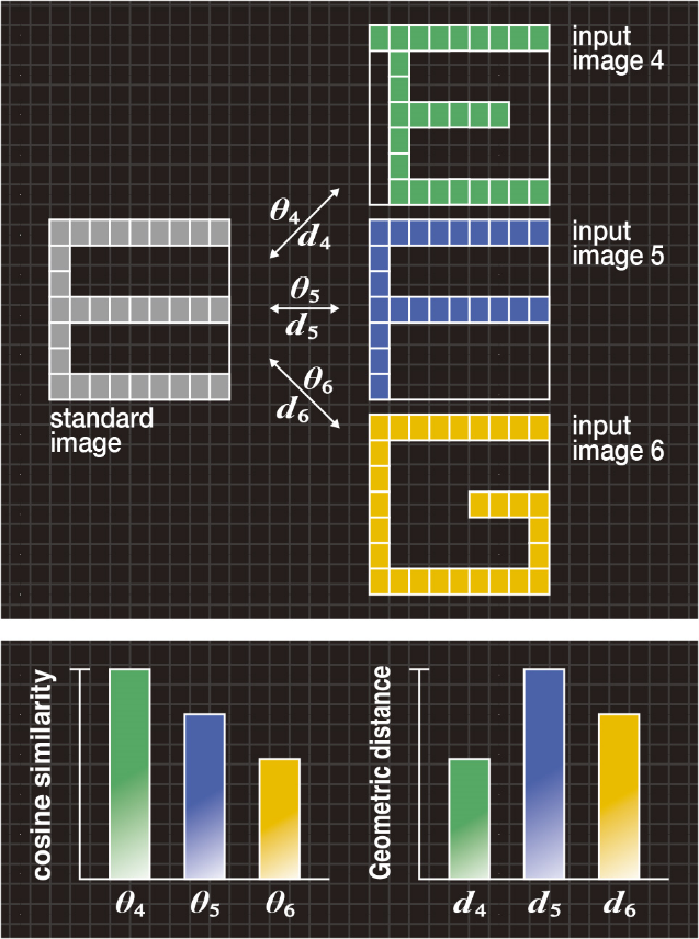 図5Bの左の棒グラフは、標準画像と各入力画像4、5、6との間のコサイン尺度θ4、θ5、θ6を示していますが、従来のコサイン尺度ではθ4>θ5>θ6となるため、アルファベット“E”を正しく認識できません。