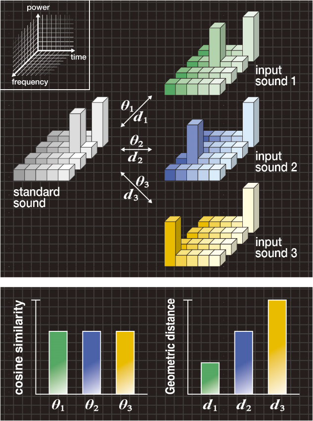 図2Bの左の棒グラフは、標準音と各入力音1、2、3との間のコサイン尺度θ1、θ2、θ3を示していますが、従来のコサイン尺度ではθ1=θ2=θ3となるため、3つの入力音を区別できません。