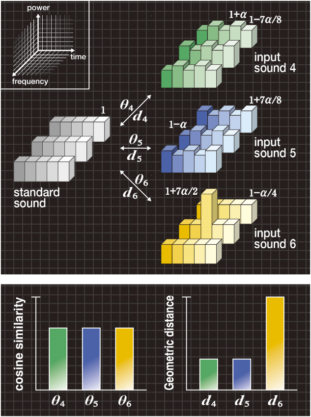 図3Bの左の棒グラフは、標準音と各入力音4、5、6との間のコサイン尺度θ4、θ5、θ6を示していますが、従来のコサイン尺度ではθ4=θ5=θ6となるため、3つの入力音を区別できません。