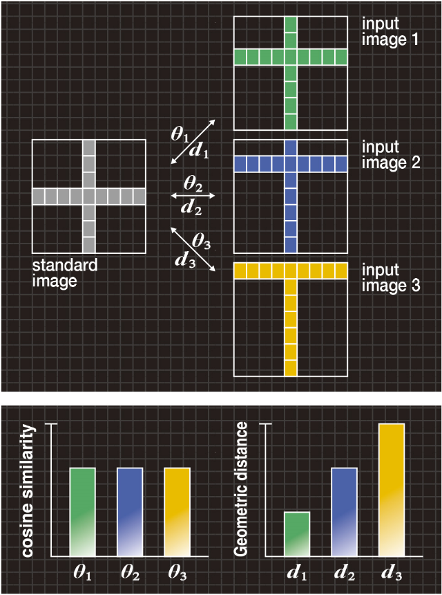図4Bの左の棒グラフは、標準画像と各入力画像1、2、3との間のコサイン尺度θ1、θ2、θ3を示していますが、従来のコサイン尺度ではθ1=θ2=θ3となるため、3つの入力画像を区別できません。