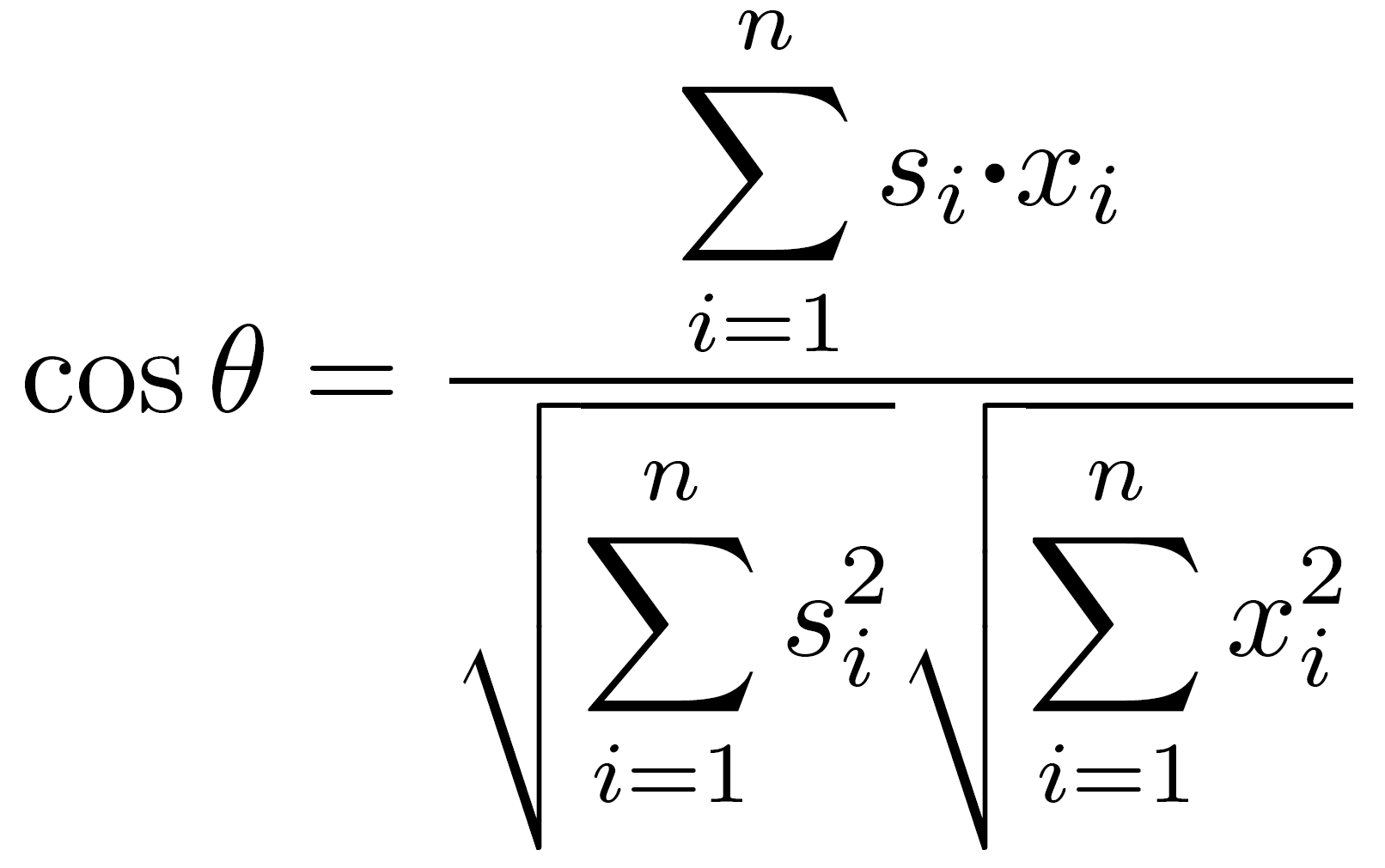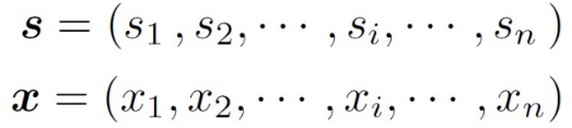 標準画像(標準音)の特徴量を成分si(i=1, 2,…, n)とする標準パターンベクトルsと、入力画像(入力音)の特徴量を成分xi(i=1, 2,…, n)とする入力パターンベクトルxを作成して、次式のように表現します。